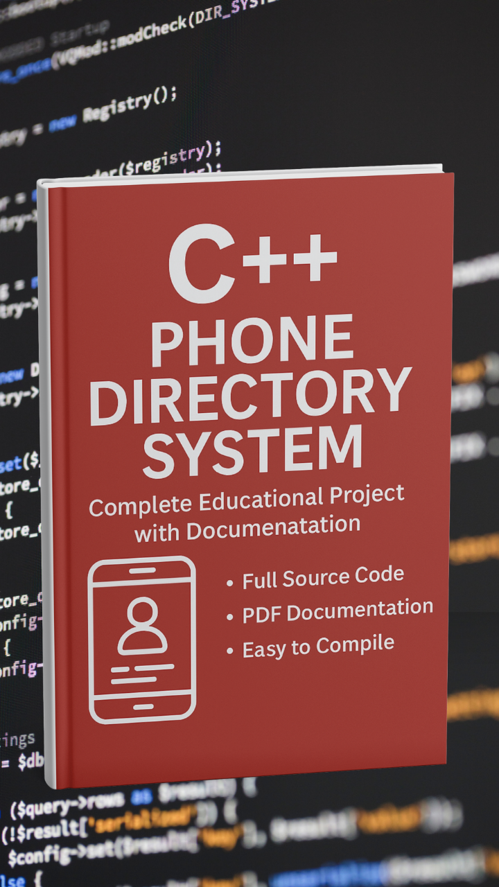 Manage phone records with full C++ source code. Includes CRUD features, CSV export, PDF documentation, and a ready-to-run console app – perfect for students and beginners.